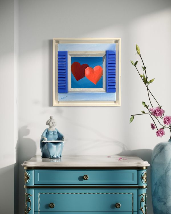 Dos corazones flotan en una ventana bañada de sol, uno junto al otro pero sin llegar a tocarse. El marco es de un azul suave, las contraventanas de un intenso índigo mediterráneo — madera real, tallada y pintada a mano. Esto no es solo una pintura; es un objeto. Del tipo que uno encuentra al caminar por una estrecha calle italiana, donde el aire huele a piedra y a mar y el pasado nunca queda lejos. Los colores son vívidos, la arquitectura imperfecta, la luz honesta. Y en el centro de todo — el amor.