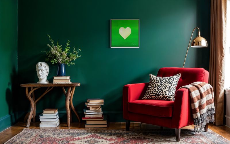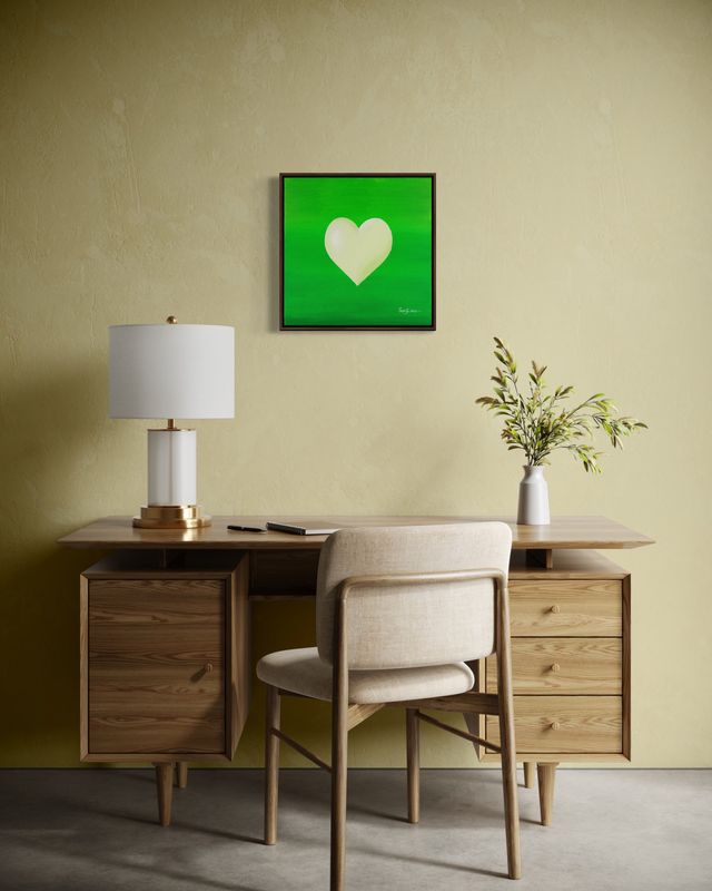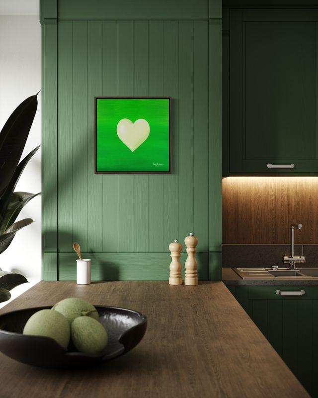 Vert, luxuriant et vivant, ce fond bourdonne d'une énergie fraîche. Le cœur blanc ne rivalise pas — il complète, comme un souffle de printemps. Une peinture qui vibre de vie, comme des feuilles qui frémissent, de l'herbe qui pousse, ou une porte qui s'ouvre sur une bonne nouvelle.