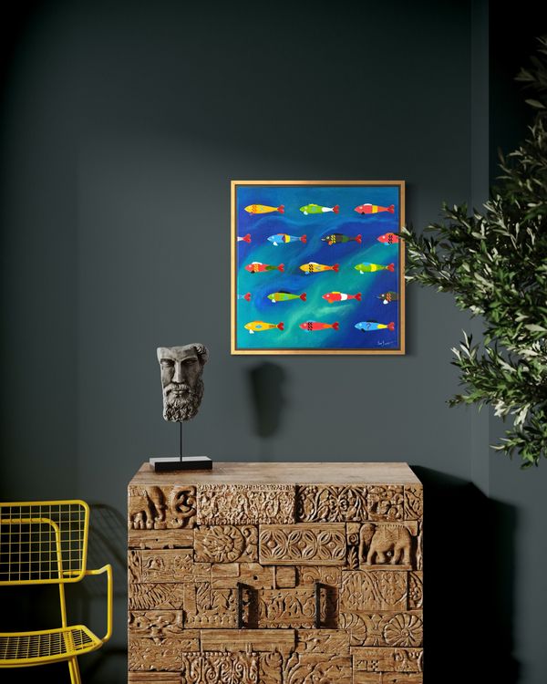 Un vivace banco di sardinhas sfreccia attraverso un oceano blu-verde in continuo mutamento, ognuna vestita con un abito stravagante tutto suo. Non ce ne sono due uguali — alcune portano simboli, altre sfoggiamo strisce o chevron, e una porta persino un punto interrogativo. Le loro code sono a forma di cuore e i loro colori esplodono di gioia festosa. Festa da Sardinhas – Lisbon pt.3 è il dipinto finale di una serie dedicata a Lisbona, che cattura lo spirito dell'amato festival delle sardine della città con umorismo, colore e movimento.