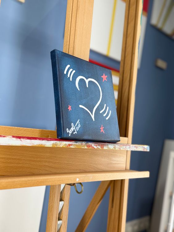 Et strålende hvitt, åpent hjerte svever over en skimrende midnattsblå bakgrunn, omgitt av myke bølgelinjer og tre lekne rosa stjerner. Det er lite — bare 20 x 20 cm — men fullt av sjarm. Hjertet ser ut til å ringe, vibrere av glede og sende signaler ut i mørket. Og de rosa stjernene? De er ikke bare pynt — de er en stille hilsen til en som alltid brakte latter i dypet: Patrick, SpongeBobs elskelige sjøstjerne og trofaste venn.
